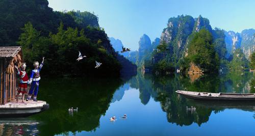 上午:游覽如仙境一般的“人間瑤池”——【寶峰湖景區(qū)】(含門票+景區(qū)環(huán)保車+游船),寶峰湖長(zhǎng)2.5公里,位于索溪鎮(zhèn)正南2公里。以其秀麗的湖光水色與幽野的洞天情趣成為武陵源水景風(fēng)光的代表之作,電視劇《西游記》中花果山水簾洞外景就拍攝于“奇峰飛瀑”。清澈無比的湖泊倒映群山,水因山而綠,山得水更青。寶峰湖已開發(fā)的景點(diǎn)以高峽平湖、鷹窩古寨、絕壁飛瀑、一線天峽谷等最為叫絕。蕩舟湖上,登玲瓏翠綠的湖心島,恍若置身畫中。