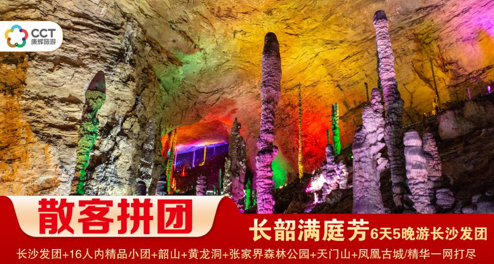 D3長沙出發(fā)乘(高鐵)赴張家界(2h抵達(dá),更方便更快捷)--下午游溶洞全能冠軍(黃龍洞景區(qū))--晚觀(民族大戲)魅力湘西晚會(huì)