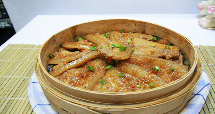 制作方法與我們平時家常菜粉蒸肉有些不同,更為復(fù)雜講究。采用合適比例的粳米和糯米,將辣椒、桂皮、八角、香葉等多種香料炒出濃郁的香氣,然后再磨成細(xì)粉,包裹在提前腌制好的肉片上,最后放入竹籠蒸制一小時。由于蒸制時間長,一部分油脂被釋放,成品軟糯潤滑油入口即化,醇香繞舌,完全沒有油膩的感覺。