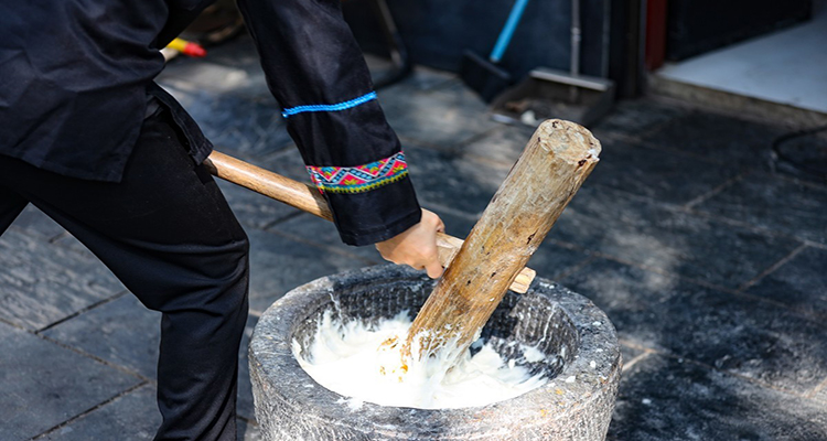 打糍粑:農(nóng)家過年時,會用糯米蒸熟后捶打成糍粑,象征團(tuán)圓美滿,常蘸糖或包餡食用。