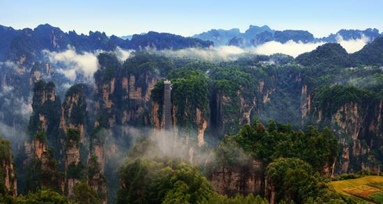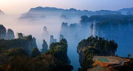 袁家界是電影《阿凡達》中“哈利路亞山”的取景地,你可以在這里探尋電影中群山漂浮、星羅棋布的魔幻世界。如果碰巧山中下起了小雨,或是等到雨后初晴,更能欣賞到霧氣彌漫、群峰疊嶂的美景。迷魂臺是理想的觀景位置,站在臺上,四周有上百座石峰矗立,氣勢磅礴。這里還能看到橫跨于兩山之間,垂直高差357米的天下第一橋。