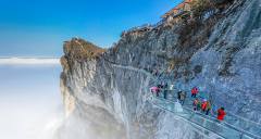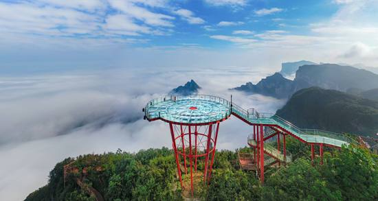 七星山屬世界罕見的喀斯特孤峰臺型地貌,四面多為約500~700 米不規(guī)則的懸崖絕壁,與張家界天門山隔峽谷并立,最高海拔 1528.6米。七星山頂為形似啞鈴狀分布的巨型丘陵臺地,平均海拔1400 米,山頂臺地面積約為32平方公里,上有較高山峰 7 座,呈北斗七星分布,因此得名七星山 。一座極具視覺沖擊力的大紅色鋼架全玻璃觀景平臺“1520天空之眼”,帶你360度俯瞰峽谷仙境及市容市貌。