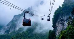 天門山索道全長7455米,水平高差1279米,沿線盡為絕壁天險,氣勢沖天,是世界上最為壯觀的索道之一。它以張家界市中心城市花園為起點,經(jīng)民間田園風(fēng)光而達山頂?shù)脑伎罩谢▓@,猶如一道彩虹飛渡“人間”“天上”。