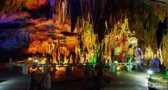 在洞內(nèi)地下河游船上你可置身于一寬度不足10米,但高達(dá)50米以上的峽谷中,而在最高處的洞頂,卻是石鐘乳垂吊如林,更若厚厚的云層蓋頂,蔚為壯觀??芍^船在水中行,人在畫中游。
