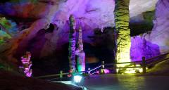 波月洞的“鵝管”長(zhǎng)短不一,參差錯(cuò)落,密密匝匝,直掛天穹,在逆光燈照下,如萬(wàn)千瑪瑙翡翠垂吊空間,晶瑩剔透,閃閃發(fā)光;觀之,不能不驚吧大自然神奇的創(chuàng)造力。