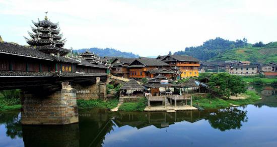 皇都侗寨由頭寨、盤寨、尾寨、新寨共同組成。前三個(gè)寨子連為一體,新寨則是處于一個(gè)半島上,由風(fēng)雨橋(普修橋)和公路相通,與另三個(gè)寨子隔河相望。